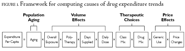For populations stratified by age and income, drug expenditure trends were studied along with the specific utilization and pricing dynamics that contribute to changes in spending over time. Changes in per capita expenditure within a specific population subgroup were disaggregated into nine expenditure drivers using index theoretic methods (Morgan 2005a). As illustrated in Figure 1, the nine specific expenditure drivers can be summarized into four categories: Population Aging, Volume Effects, Therapeutic Choices, and Price Effects.