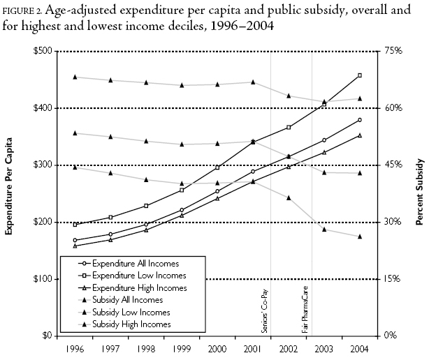 Results: The BC Ministry of Health was successful in reducing the public share of drug expenditure through the introduction of seniors' co-payments in 2002 and then income-based pharmacare in 2003. The policy change did not have major effects on aggregate expenditure trends in the province. While several statistically significant changes in expenditure dynamics occurred during the period of study, only an increase in seasonal "stockpiling" of medicines by seniors can reasonably be attributed to the policy changes.