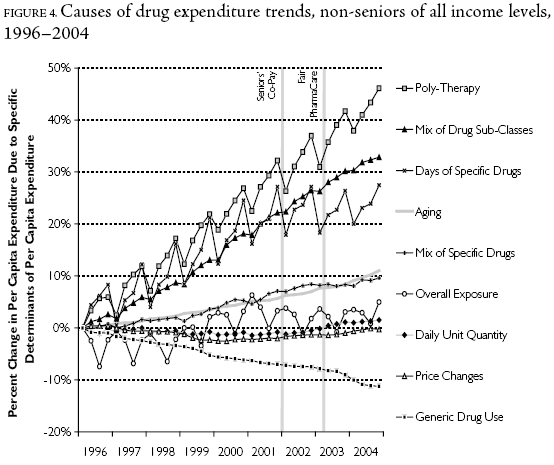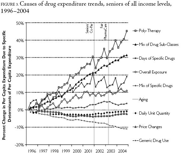 Time series analysis consistently indicated that the rate of drug expenditure growth slowed in British Columbia following 2002Q1, and that this trend was at least partially attributable to slower growth in the volume of drugs purchased. This finding was consistent across all age and income groups, suggesting that it was a sectorwide phenomenon and not the result of the implementation of the seniors' co-payment in 2002 or income-based pharmacare in 2003. One would expect age- and income-based policy changes to have different effects on households of different ages and incomes. So, slower growth in drug utilization observed in this study must have stemmed from overarching trends in the province rather than the age- and income-targeted policy changes.