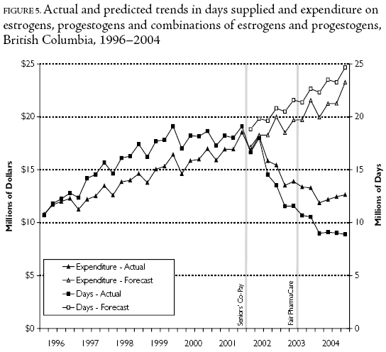 Potential explanations of the downturn in utilization include the reduction in the use of hormone replacement therapy (HRT) that followed the early termination of the Women's Health Initiative study of HRT in 2002 (Writing Group for the Women's Health Initiative 2002). The study of preventative use of HRT among 16,000 healthy post-menopausal women was halted because of concerns that HRT (specifically, estrogen plus progestin) increased the risk of breast cancer and heart disease. The immediate impact of this finding was to reduce the use of HRT. Evidence of this can be found in the BC data. Figure 5 illustrates the actual and predicted trends in the days supplied and expenditure on estrogens, progestogens and combinations of estrogens and progestogens for British Columbians from 1996 to 2004. The decline in use of these medicines relative to trend occurred across all income categories and represented an annual reduction in spending (relative to trend) of over $30 million in BC.