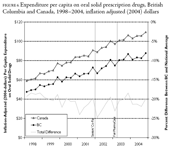 Methods: We employed a longitudinal research design using PharmaNet records of every prescription dispensed in the province from January 1996 to December 2004. Expenditure dynamics were analyzed using non-stochastic decompositions of trends. Analyses were stratified by five age categories and five socio-economic quintiles. The effect of the policy on expenditure trends and their sources was assessed using time series analysis. Additional analyses, using equivalent methods, were conducted using market-level data to compare per capita expenditure in British Columbia to the Canadian average over the period 1998-2004.