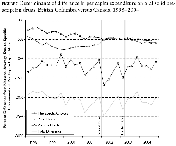 This analysis indicates that the BC Ministry of Health was successful in reducing the public share of drug expenditure in recent years. It did so through the introduction of temporary seniors' co-payments in January 2002 and the subsequent reorganization of the public drug program into an income-based benefit in May 2003. The changes in the size, nature and distribution of public subsidy that resulted from these program changes do not appear to have had major effects on aggregate expenditure trends in the province. While several statistically significant changes in expenditure dynamics occurred during the period of study, careful analysis of provincial and national trends suggests that only changes in seasonal "stockpiling" of medicines by seniors can reasonably be attributed to the policy changes.