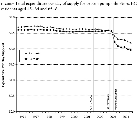 The likely reason for the 2003Q3 reduction in expenditures related to the mix of specific drugs is the preferential listing of a proton pump inhibitor (PPI) in July 2003, or 2003Q3 (British Columbia 2003). PPIs are the fourth largest drug class in terms of expenditure in the province, and the new policy would provide subsidy only for patients who first tried a preferentially listed brand that was less costly than other brand-name competitors in the drug class.
