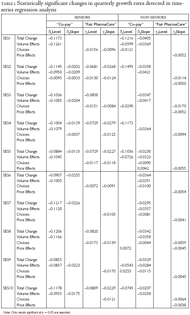 Statistical analyses of expenditure dynamics were computed for 20 population subgroups: two broadly defined age groupings (seniors and non-seniors) stratified by 10 income deciles. Time series analyses can confirm some of the findings that are visually detectable in Figure 3 and Figure 4. Table 1 lists regression results for seniors stratified by income deciles and for non-seniors stratified by income deciles. The table provides coefficient estimates only for those policy-specific coefficients that were statistically significant at significance p = 0.05. One finding was consistently detected across all 20 of the regression analyses reported: total expenditure trends slowed slightly following 2002 for all age and income groups; and, for every age and income group, slower growth in volume effects was detected.