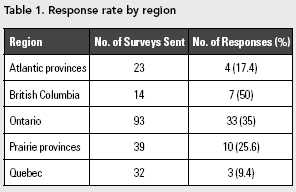 The response rates were lowest among hospitals with fewer than 100 beds and greatest among the larger hospitals (>400 beds). From e-mail correspondence with potential participants, we gathered that the reason some small hospitals did not reply is that little routine cancer surgery is performed at such centres - patients are referred elsewhere. For the 32 surveys sent to Quebec hospitals, only three responses were received, despite the fact that the survey had been translated into French. While there was a delay in sending the translated version of the survey to Quebec, thereby reducing the amount of response time given, this does not satisfactorily explain a 9% response.
