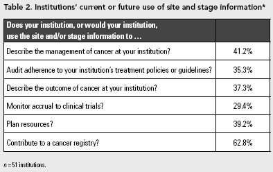 Twenty-nine institutions (50.8%) indicated that they had mechanisms in place to ensure the completeness of cancer stage recording. Overall, 83.3% of responses indicated that physicians are responsible for recording stage. However, only 9.6% of institutions have a mechanism in place to ensure the accuracy of the TNM stage recording. Of the institutions surveyed, 29.1% routinely compile a yearly report of the number of new cases of cancer by primary cancer site; only 5.5% of institutions routinely compile a yearly report of new cases of cancer by stage. Table 2 illustrates how institutions currently or would in the future use site and stage information.