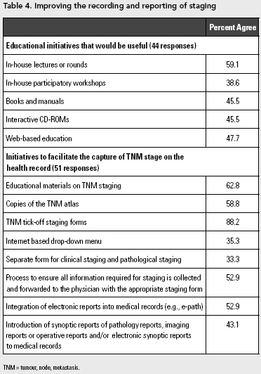 In addition to the targeting of policy and initiatives to physicians, collaboration with health records professionals is needed to provide support and to aid physicians. We assume that all physicians involved in the care of patients with cancer stage the extent of the disease as it is impossible to determine the appropriate treatment without knowing the stage (O'Sullivan et al. 1998a); however, we did not inquire about this in the survey. Clinicians should but do not always record the stage in the patient charts. If collaboration with health records professionals is established, then a well-trained team of these professionals, who will have a familiarity with TNM staging, can help ensure that staging is collected on every new case of cancer seen at each hospital.
