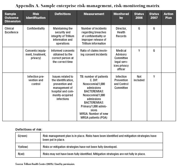 Trillium Health Centre. 2007b. Enterprise Risk Management Risk Monitoring Report. Mississauga, ON: Author. Unpublished internal document.