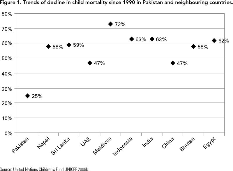 The World Health Organization (WHO) (2006) has reported that infant, child and maternal mortality in Pakistan is one of the highest in South Asia and in the developing world. This picture reflects the low priority the Government of Pakistan has given to development of the social sector and in particular the low investment in the health sector, below that even of neighbouring countries in South Asia, according to the World Bank (1999). In a country where 74% of the people live below the poverty line (less than 2 US dollars a day) and where out-of-pocket expenditure for health is nearly 80%, health spending has been less than 1% of the central government's total expenditure for over a decade (World Bank 2006). While the health status of the population in general has improved over the past three decades, under-five mortality remains unacceptably high (93/1000 live births) for both male and female children in Pakistan and has been declining at a very slow pace compared to many other countries in the region (United Nations Children's Fund 2008b).