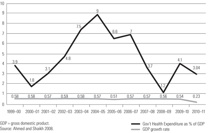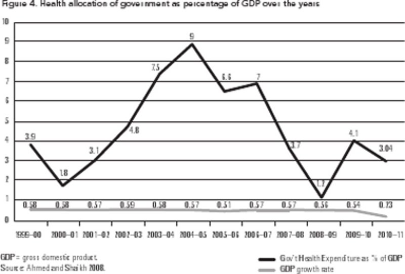 Although the government's health budget has been gradually increasing over the last few years, no absolute increase has been observed in terms of percentage of GDP, which has remained stagnant at or below 1%, as shown in Figure 4 (Ahmed and Shaikh 2008). Devolution has come with many opportunities as well as some risks in the management of heath financing in the provinces.