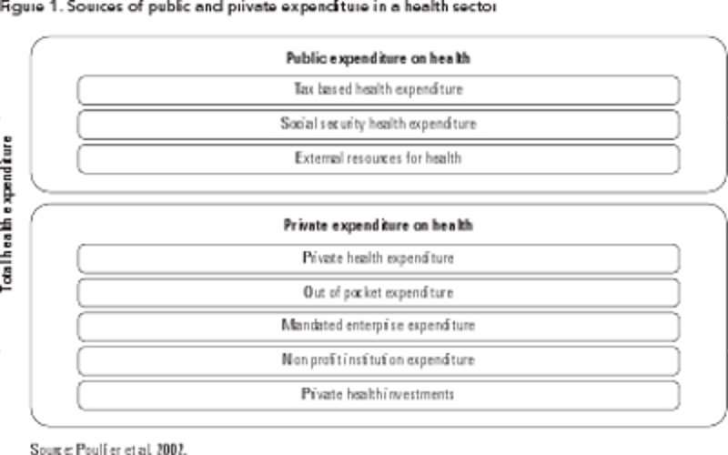 The total healthcare expenditure in a country is usually sourced through a mix of public and private spending, as shown in Figure 1 (Poullier et al. 2002). More reliance on private health expenditures without a mechanism to enforce regulations is likely to promote inequity, inaccessibility and financial hardship in healthcare seeking. Every year, 11% of the population in African and South Asian countries suffers severe financial hardship, and 5% falls below the poverty line. Inappropriate and inadequate financial mechanisms for public health expenditures and low income add an enormous burden on low-income quintiles. Coverage for social security protection in middle-income countries varies from 20% to 60%, compared with 5% to 10% in African and South Asian countries (World health Organization 2005). Since most low-income countries are not on track to achieve MDG targets, the developing an impetus to identify health financing mechanisms that address the coverage gaps for universally accessible health services is critical.