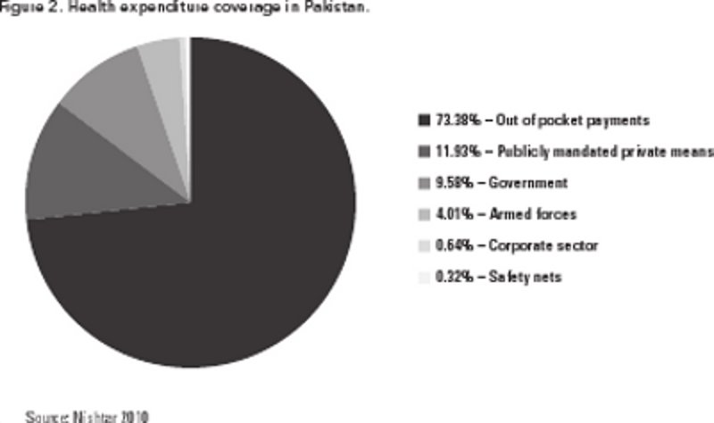 Current health insurance schemes in Pakistan cover only 5% of the population (Asian Development Bank 2005). Likewise, Zakat (the Islamic concept of a luxury tax on 2.5% of dormant wealth over a certain amount unused for a year, collected and used in specified categories), Bait-ul-Maal (a treasury of an Islamic government, used to provide income for the needy, including the poor, elderly, orphans, widows and the disabled) and private health insurance are the other financing mechanisms, catering to a very small proportion of the population.