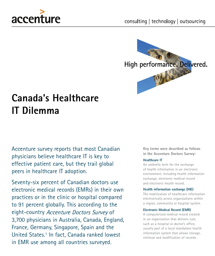 Seventy-six percent of Canadian doctors use electronic medical records (EMRs) in their own practices or in the clinic or hospital compared to 91 percent globally. This according to the eight-country Accenture Doctors Survey of 3,700 physicians in Australia, Canada, England, France, Germany, Singapore, Spain and the United States.1 In fact, Canada ranked lowest in EMR use among all countries surveyed.