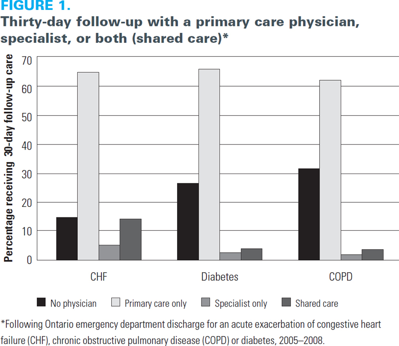 Is inadequate follow-up after ED visits a common problem? In another ICES study (Schull et al. 2013), investigators looked at patients discharged from Ontario EDs following an acute exacerbation of congestive heart failure (CHF), chronic obstructive lung disease (COPD) or diabetes, all conditions where follow-up visits are recommended. We found that 15–31% of patients saw no physician within 30 days of ED discharge (Figure 1). About 65% of patients saw only their primary care physician in follow-up; the proportion seeing both a primary care physician and a relevant specialist varied from 3% (COPD) to 14% (CHF). This may not be too surprising, considering that fewer than one in three primary care physicians in Canada report always being notified when their patients visit an ED (Schoen et al. 2012). If physicians are not advised of the ED visit, how are they to ensure appropriate follow-up?