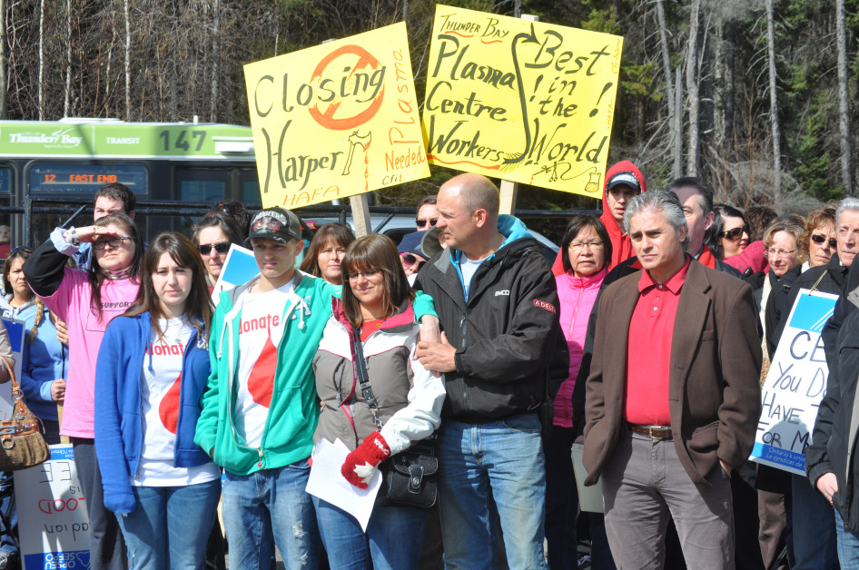 2012 protest in Thunder Bay against the closure of CBS’ plasma clinic. Health Canada claims — without any evidence — that self sustainability in blood products in impossible under a volunteer system, but we’ll never know if CBS continues to downsize its operations.