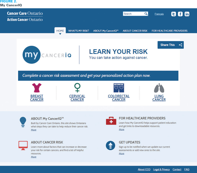 Research suggests that individuals may over- or under-estimate their cancer risk and that there is a need for better cancer risk information and engagement among the public (Colditz et al. 2000). The MOHLTC funded CCO to create an online tool that will allow Ontarians to assess their personal cancer risk and learn about risk factors, disease prevention and cancer screening. In an effort to encourage Ontarians to engage in prevention activities, My CancerIQ provides links to provincial and community supports, such as programs geared towards smoking cessation and healthy eating. Built on an evidence-based algorithm, the first release (early 2015) of My CancerIQ focuses on lung, female breast, colorectal and cervical cancers. In addition to increasing Ontarians' knowledge about disease prevention, My CancerIQ can be used as a platform to inform discussions with healthcare providers and is intended to increase awareness and uptake of breast, colorectal and cervical cancer screening (Figure 2).