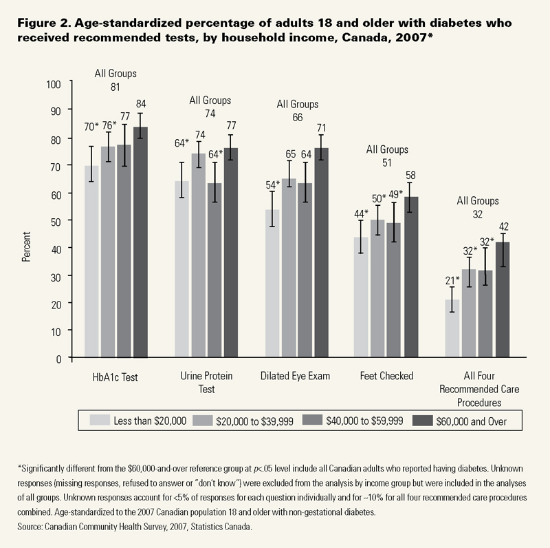 This article summarizes more detailed findings presented in the Canadian Institute for Health Information (CIHI) analysis-in-brief titled Diabetes Care Gaps and Disparities in Canada (CIHI 2009).