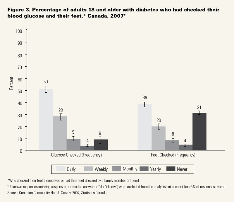 Two self-care activities for diabetics include self-monitoring of blood sugar levels and checking feet for cuts, cracks, bruises, blisters, sores and infections (Canadian Diabetes Association Clinical Practice Guidelines Expert Committee 2008). By regularly performing self-care activities, patients reduce the likelihood of developing diabetic complications such as foot ulcers and amputations. Only half of adults with diabetes check their blood sugar levels daily, and only about two in five adults with diabetes check their feet daily (Figure 3).