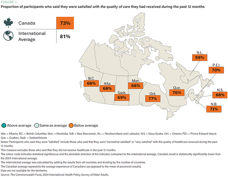 Older adults in Canada were also the least likely to feel satisfied with their overall care over the past year compared with the other countries surveyed, with over one in four who had received care saying that they were not at least somewhat satisfied. Satisfaction rates varied across the country – from 59% in Newfoundland and Labrador to 77% in Ontario – although all provinces scored below the international average (Figure 1).