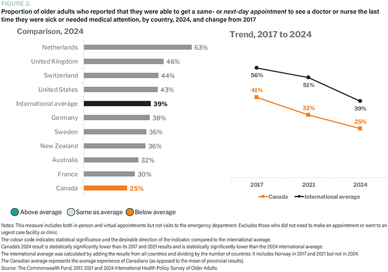 Timely access is an even bigger challenge. Only one in four older adults in Canada reported being able to get a same- or next-day appointment with a doctor or nurse the last time they needed one. Again, this was the lowest rate among all countries surveyed, with both Canada's result and the international average declining significantly from previous surveys in 2021 and 2017 (Figure 2).