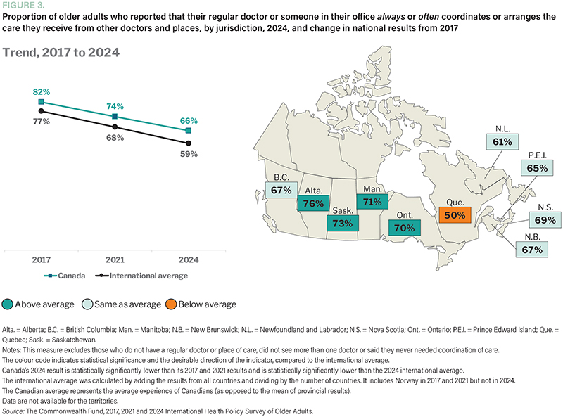Canada has consistently performed well in care coordination compared to international peers. Among older adults who saw multiple health providers, for example, two in three said that their regular doctor “always or often” helped coordinate their care. That said, the data show a clear downward trend in both Canada and peer countries. Furthermore, there is significant variation across provinces – from 50% in Quebec, below the international average, to 76% in Alberta (Figure 3).